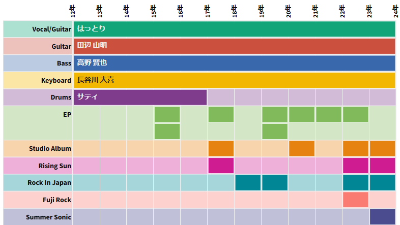 バンドの来歴についてロックバンド・マカロニえんぴつについて、バンドの略歴・ライブツアーのセットリストをグラフ等で可視化し人気曲・アルバムを紹介。画面の小さいスマホの場合、横向き又はピンチイン/ピンチアウトすると見やすいかと思います。タイムラ...