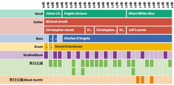 バンドの来歴についてスウェーデンのメタルバンドアーチ・エネミーについて、評価や来日公演のセットリストをグラフ等で可視化し人気曲やおすすめのアルバムを紹介。画面の小さいスマホの場合、横向き又はピンチイン/ピンチアウトすると見やすいかと思います...