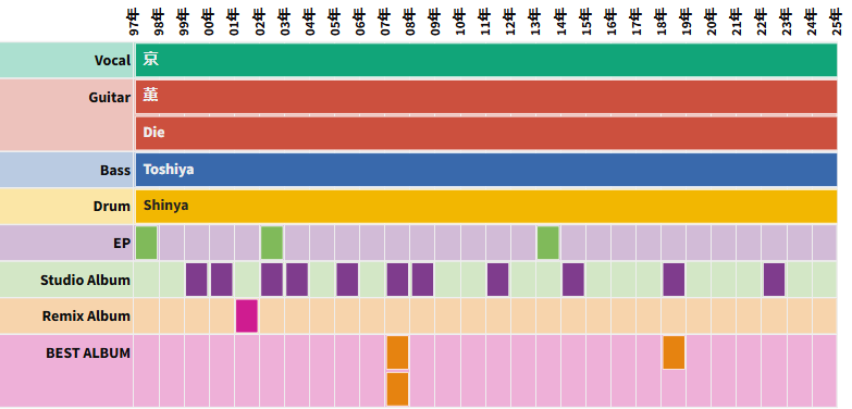 バンドの来歴についてディルアングレイについて、バンドの略歴・ライブツアーのセットリストをグラフ等で可視化し人気曲やおすすめのアルバムを紹介。画面の小さいスマホの場合、横向き又はピンチイン/ピンチアウトすると見やすいかと思います。タイムライン...