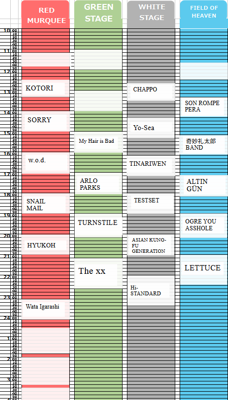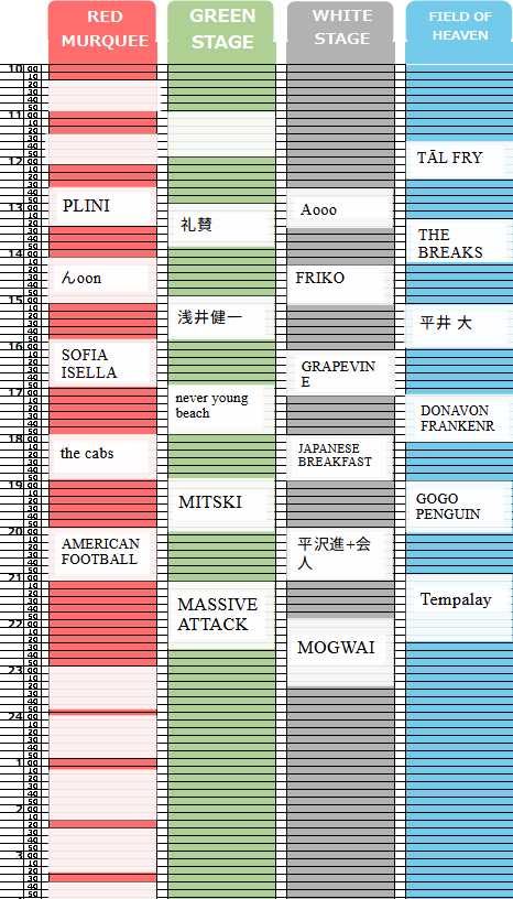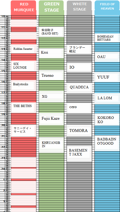 FUJI ROCKの出演者が発表されたので昨年のタイムテーブルを参考に予想タイムテーブルを作成してみました。