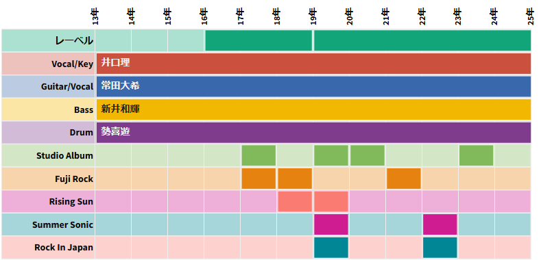 バンドの来歴についてキングヌーについて、バンドの略歴・ライブツアーのセットリストをグラフ等で可視化し人気曲やおすすめのアルバムを紹介。画面の小さいスマホの場合、横向き又はピンチイン/ピンチアウトすると見やすいかと思います。タイムライン年単位...