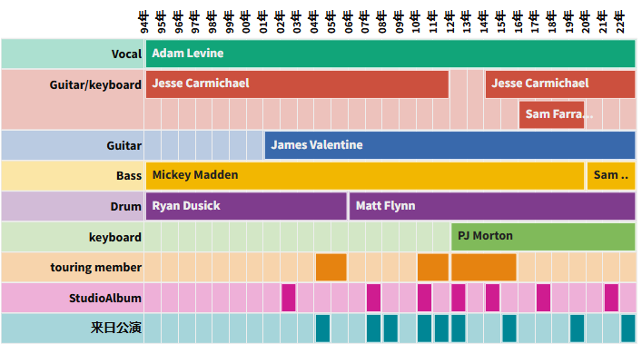 バンドの来歴についてアメリカ・カリフォルニア州のロックバンドマルーン5について、評価や来日公演のセットリストをグラフ等で可視化し人気曲やおすすめのアルバムを紹介。画面の小さいスマホの場合、横向き又はピンチイン/ピンチアウトすると見やすいかと...