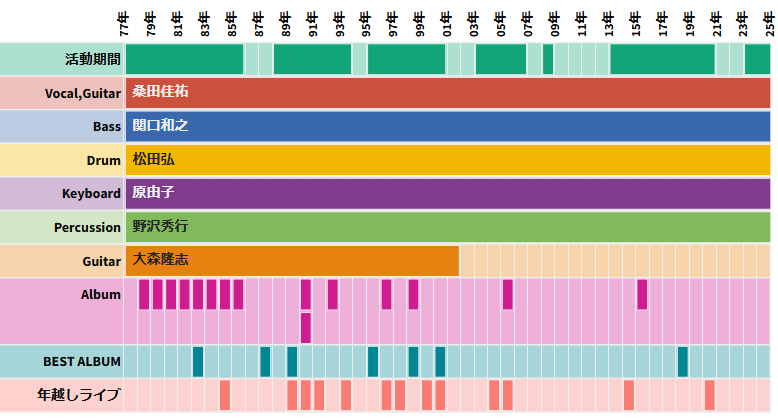 アルバムリリース時のメンバーをタイムラインで表示。