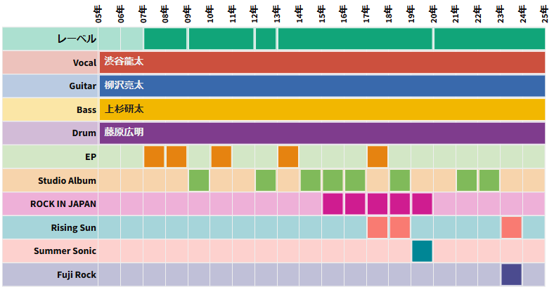 バンドの来歴についてロックバンド・スーパービーバーについて、バンドの略歴・ライブツアーのセットリストをグラフ等で可視化し人気曲やおすすめのアルバムを紹介。画面の小さいスマホの場合、横向き又はピンチイン/ピンチアウトすると見やすいかと思います...