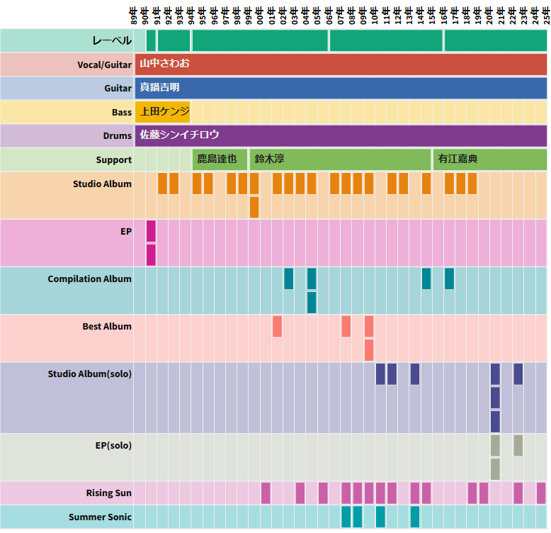 バンドの来歴についてロックバンド・ザ・ピロウズについて、バンドの略歴・ライブツアーのセットリストをグラフ等で可視化し人気曲・アルバムを紹介。画面の小さいスマホの場合、横向き又はピンチイン/ピンチアウトすると見やすいかと思います。タイムライン...