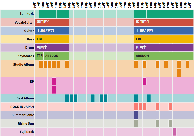 バンドの来歴についてバンド・UNICORNについて、バンドの略歴・ライブツアーのセットリストをグラフ等で可視化し人気曲・アルバムを紹介。画面の小さいスマホの場合、横向き又はピンチイン/ピンチアウトすると見やすいかと思います。タイムライン年単...